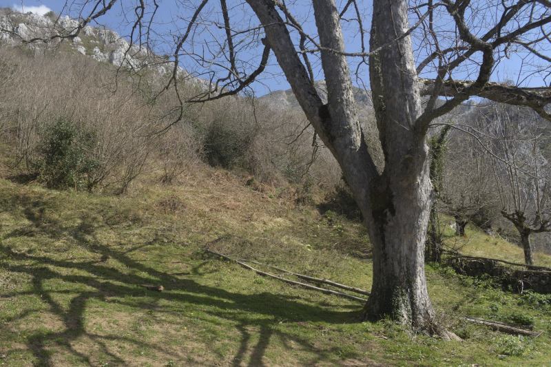 Comenzamos a caminar junto a la iglesia de San Juan en Collanzo, por una estrecha carretera local en dirección a Santibañez de la Fuente, donde podemos contemplar un hermoso tejo.